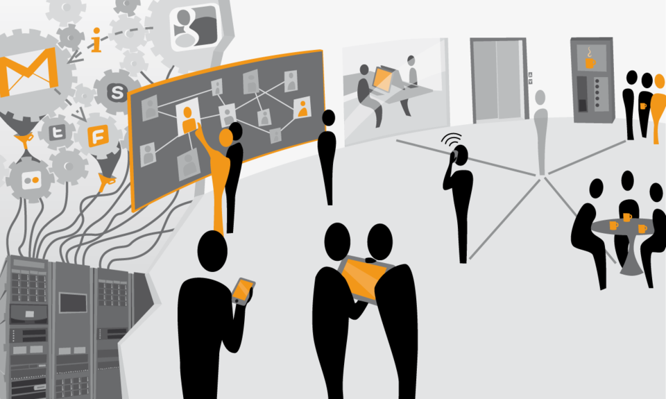 | Technische Integration verschiedener Datenquellen und Dienste zur Zusammenarbeit (vgl. Abb. linke Hälfte) | Einbeziehung innovativer ubiquitärer Benutzerschnittstellen für Kooperationssysteme (vgl. Mitte der Abb.) | Gestaltung und soziale implikationen des Einsatzes von Social Software im Unternehmen (vgl. Abb. rechte Hälfte) |