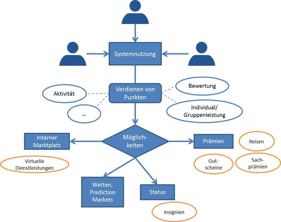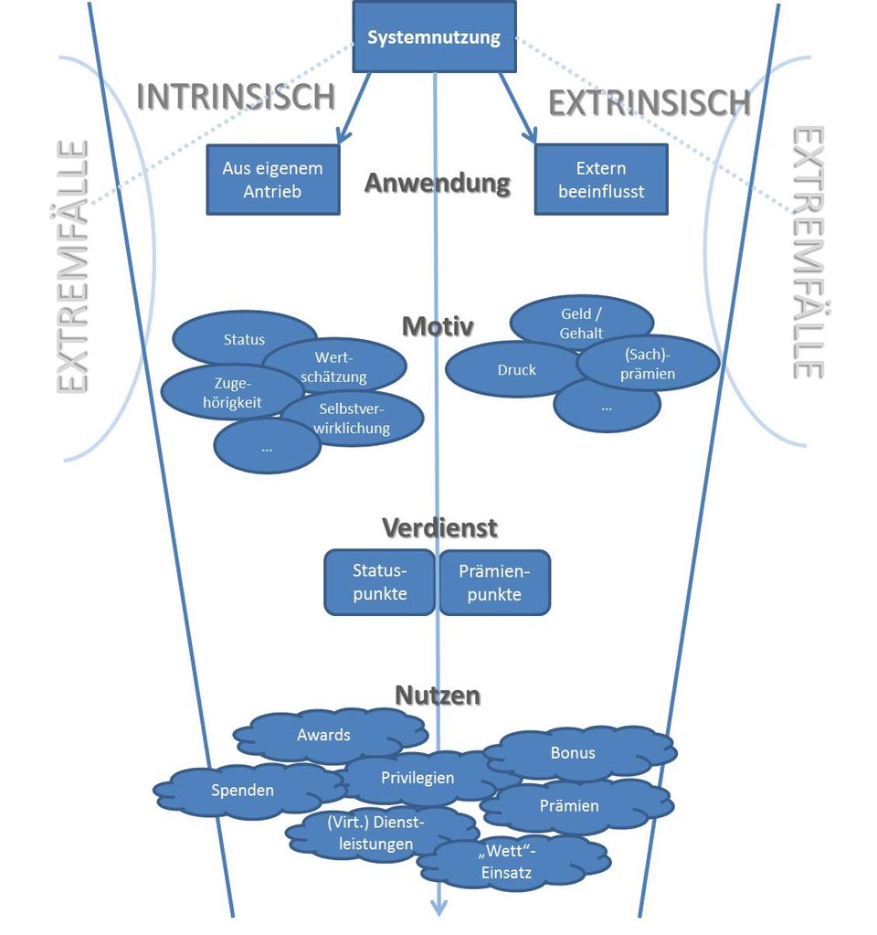 Bei der Einführung von Kooperationssystemen sehen sich Unternehmen häufig mit der Herausforderung konfrontiert, wie sie die späteren Nutzer zur Systemnutzung motivieren können. Vor diesem Hintergrund untersucht der vorliegende Artikel, inwieweit sich ein Anreizsystem 1. Auf der nächsten Ebene steht das Motiv, also aus welchem (psychologischen) Grund das System genutzt wird, beispielsweise weil man sich einer Gruppe (Community) zugehörig fühlen möchte oder einfach weil man dafür bezahlt wird. Auf der folgenden Ebene steht der Verdienst innerhalb des Systems, in der Regel in Form einer oder mehrerer virtuellen Währungen, die an dieser Stelle Status- bzw. Prämienpunkte heißen sollen. Am Ende steht der individuelle Nutzen für Systemanwender, also das, was man letztendlich für seinen Einsatz oder seine Aktivität im System erhält. An alle diese Ebenen können bestimmte Anforderungen gelegt werden, um daraus sinnvolle Bausteine für einzelne Aspekte eines integrierten Anreizsystems abzuleiten: