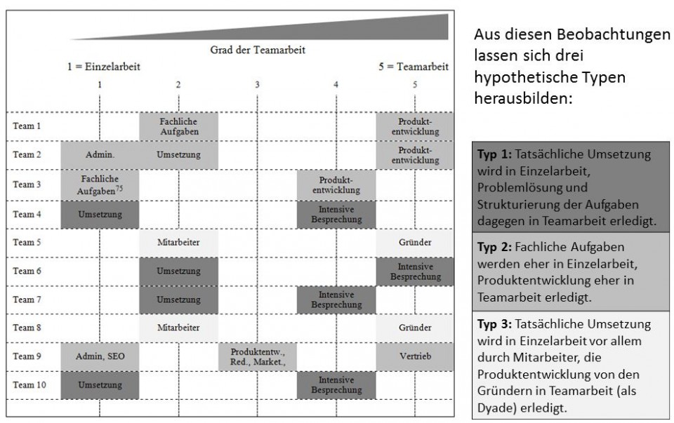 Zur Ermittlung des Grades der Teamarbeit wurde in den Interviews eine Einordnung der verschiedenen Tätigkeiten in eine Skala von 1 (für Einzelarbeit) und 5 (für Arbeit im Team) erfragt. Für Team 1 (Team wird in Abbildungen abgekürzt mit T) ist z.B. zu beobachten, dass das Produkt in Teamarbeit entwickelt wird. Die fachlichen Aufgaben wie Buchhaltung, Businessplan schreiben, Programmieren, finden eher in Einzelarbeit statt. Bei Team 4 wird „alles“ besprochen und die Aufgaben dann in Einzelarbeit umgesetzt. Bei Team 5 sind die Gründer „Teamarbeiter“ und die Mitarbeiter reine „Umsetzer“. Ergebnis der Analyse aller Interviews hinsichtlich des Grades der Teamarbeit ist eine Einordnung der Unternehmen in drei Klassen (siehe folgende Abbildung).