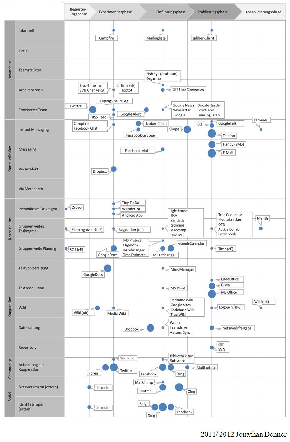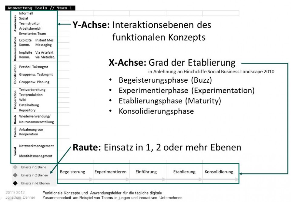 Zur Erhebung der eingesetzten Werkzeuge und deren Zwecks wurde eine Collaboration-Map verwendet. Die Collaboration-Map ist ein neuentwickeltes Werkzeug und orientiert sich im Grad der Etablierung an der Social Business Landscape (Hinchcliffe, 2010) 7. Das qualitative Koordinatensystem spannt einen Raum auf, in welchem die Werkzeuge je nach Grad der Etablierung und der realisierten Interaktionsebenen aufgeführt werden (siehe folgende Abbildung). Die Überlegungen zur Strukturierung des Koordinatensystems sind in (Denner, 2011) 4 ausführlich erläutert und stützen sich auf verschiedene Grundlagenarbeiten, z.B. (Dix et al., 1995) 8, (Gross & Koch, 2007) 9, (Koch & Richter, 2009) 2, (McAffee, 2006) 10, (Neubert, 2010) 11 und (Williams, 2011) 12.