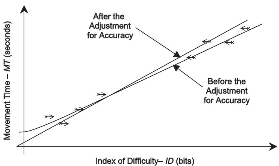 Das Maß T erlaubt dann einen Vergleich der Leistungsfähigkeit eines Zeigegerätes bei verschiedenen Aufgaben oder verschiedener Zeigegeräte bei derselben Aufgabe. Zusätzlich kann mittels linearer Regression anhand der Wertepaare (IDe,tm) der einzelnen Konditionen überprüft werden, ob ein linearer Zusammenhang zwischen dem effektiven Schwierigkeitsindex und der dafür benötigten Auswahlzeit besteht und das Zeigegerät sich somit gegebenenfalls konform zu Fitts‘ Law verhält.