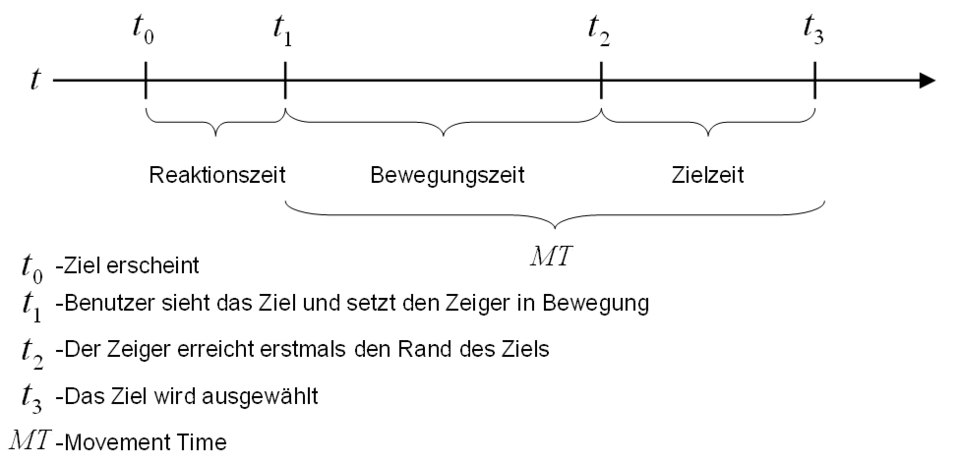 Wurde die für das Einsatzszenario des Eingabegerätes geeigente Testform gewählt und eine Menge von Entfernungs-Zielbreite-Kombinationen festgelegt, wird eine korrekte Erfassung der Nutzerinteraktion während Durchführung des Tests vorgenommen. Dabei sind einige Maße zu erheben, die für die spätere Bewertung notwendig sind. Eines dieser Maße ist die Bewegungszeit MT (Movement Time), also die Zeit, die ab dem Moment vergeht, ab dem der Nutzer den Zeiger in Zielrichtung in Bewegung setzt bis das Ziel ausgewählt wurde.