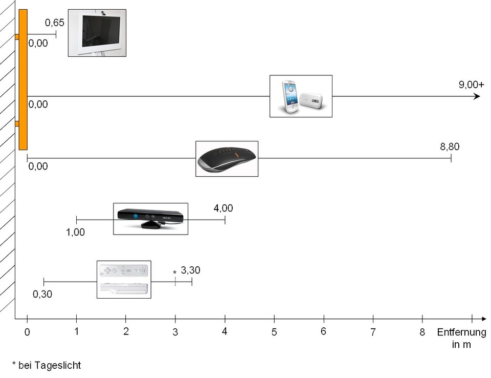 In Kürze folgt hierzu ein weiterer Bericht zu einer durchgeführten Evaluation über die Eignung verschiedener Eingabegeräte für die Steuerung eines großen Wandbildschirms unter Einhaltung der ISO-Vorgaben. Dabei wurden die Eigenschaften von fünf Interaktionsmechanismen aus unterschiedlichen Entferungen zu einem großen Wandbildschirm untersucht. Konkret handelte es sich dabei um die Nintendo Wii Remote, die Logitech MX Air Mouse, einen Friendlyway d-sign 52 Touchscreen, einen Microsoft Kinect Sensor und ein HTC Magic Smartphone.