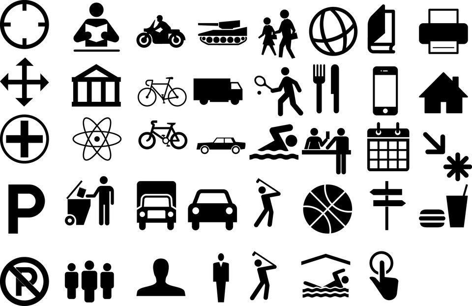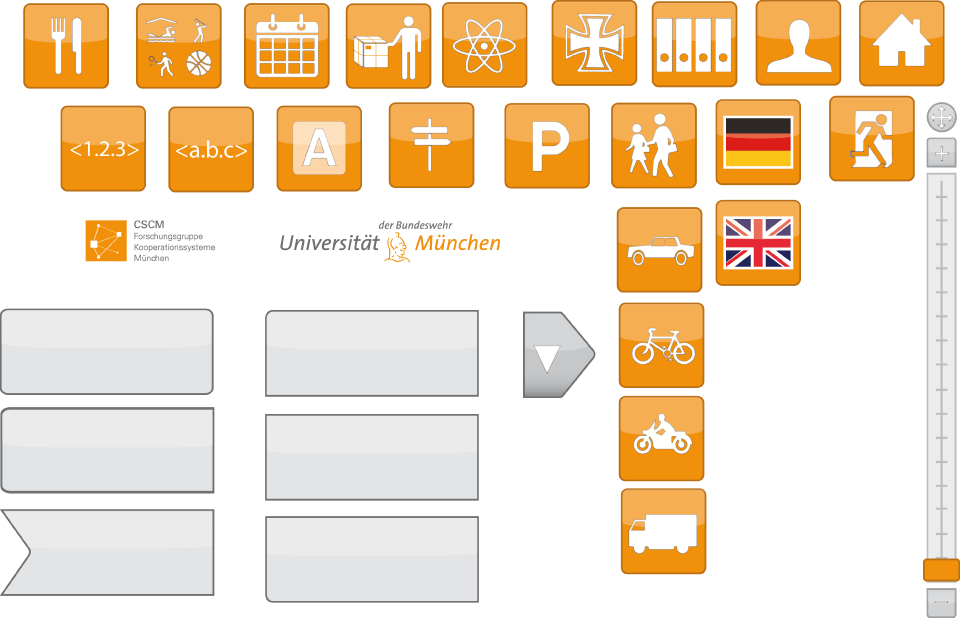 Die Problematik einer nicht fest definierten Sprache ist jedoch, dass man sie schnell missverstehen kann. Die verwendeten Icons müssen daher gut überlegt sein. Im Falle der zu Grunde liegenden Bachelor Arbeit wurden zu jeder Aktion mehrere unterschiedliche Buttons erstellt, die dann durch eine kurze Benutzerstudie bewertet wurden. Fall keines der Standard-Icons ausreichend gut wiedererkannt wird, kann es durchaus notwendig sein, eigne Icons zu entwickeln. Dies geschah im vorliegenden Fall beispielsweise für den Button „militärisch“ der Navigationssoftware, da die Seite „The Noun Projekt“ keine sinnvollen Möglichkeiten bat. Die folgende Abbildung zeigt einige der erstellten Icons.