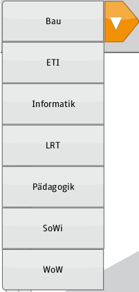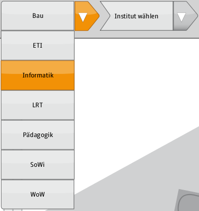 Für die GUI des Navigationssystem wurde eine eigene Dropdown Box entwickelt. Das Konzept der Dropdown Boxen ist in den folgenden Abbildungen gezeigt. Die Form und Anordnung der Elemente ist an die der Navigationsführung der Cityterminals 2.0 angelehnt. Die linke Abbildung zeigt die Umsetzung auf einem Cityterminal. In der rechten Abbildung ist das entwickelte Mock-Up-Konzept und die grafisch verfeinerte Realisierung zu sehen.