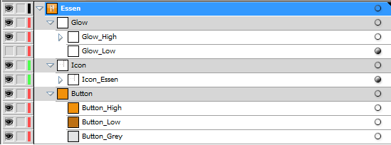 Die Buttons besitzen eine Grundfläche und entsprechende Layer. Durch einen mehrfarbigen Hintergrund und weitere Effekte können verschiedene Abstufungen geschafft werden. Hierzu muss es einen Layer geben, in dem Texte oder Symbole eingefügt werden können. Die nachfolgende Abbildung zeigt eine sinnvolle Anordnung der Layer und ihre Bezeichnung, um sie in der GUI zu verwenden.