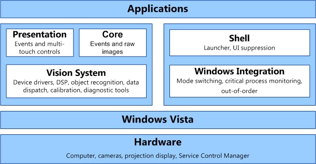 Applikationen die mit dem neuen Surface SDK erstellt wurden, lassen sich gleichzeitig mit Surface 2.0 und Windows 7 betreiben: „Write Once Touch Anywhere“. Neben einer Core API mit Zugriff auf die Raw IR Images und Touch Events des Vision Systems, wird es wieder eine WPF API mit neuen Anwendungs-spezifischen Touch Controls geben. Die Hardware umfasst einen AMD Athlon II X2 2.9 GHz Dual-Core mit 4-8 GB RAM, 320 GB HDD, sowie einer AMD Radeon HD 6570M 1 GB GDDR 5 DirectX 11-kompatiblen Grafikkarte mit HMDI-Ein/Ausgang. (Quellen: ZDNet, Luis Cabrera)
