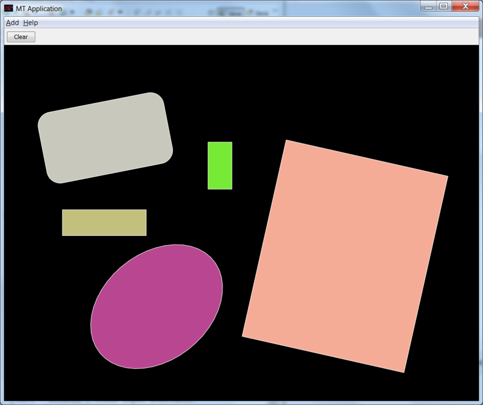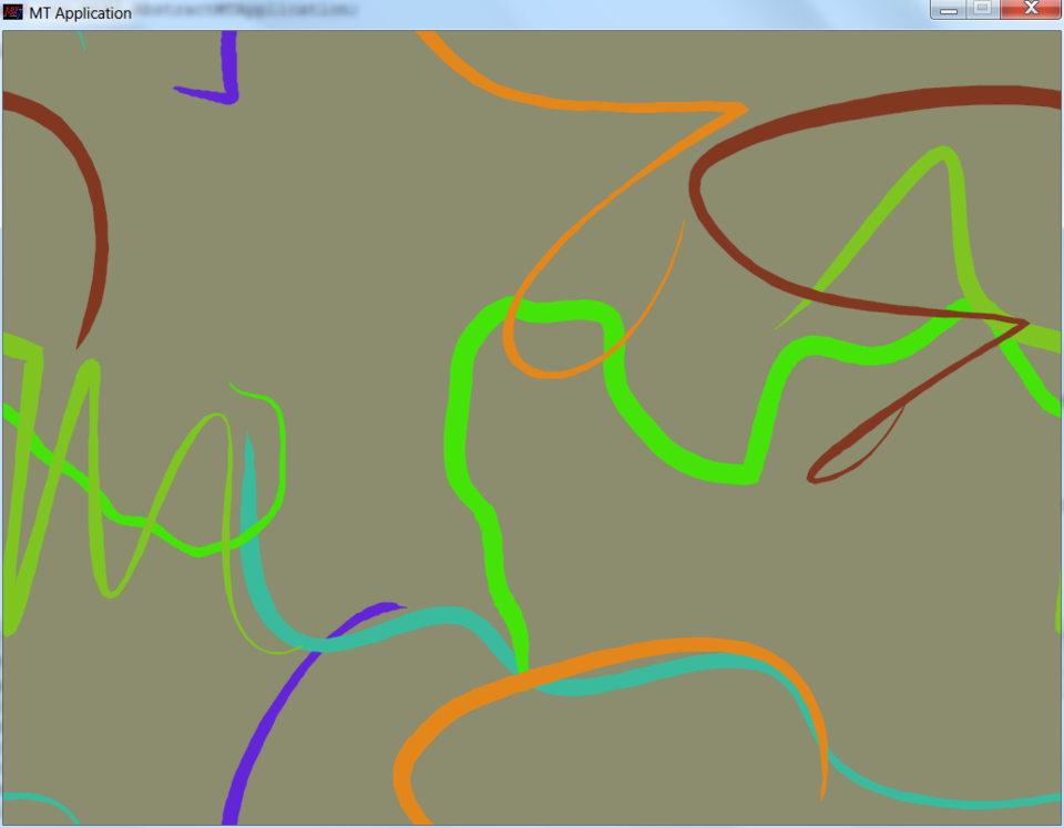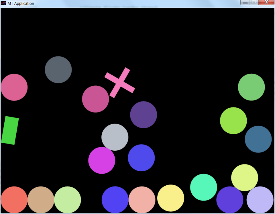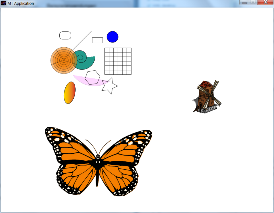 Das MT4j-Paket enthält 19 einfache Beispielanwendungen. Diese sind unterteilt in die Pakete „basic“ und „advanced“ und sind im Ordner „examples“ zu finden. Die Basic Examples dienen zum Verstehen und Testen der grundlegenden Techniken in sehr einfach gehaltenen Applikationen. Die Advanced Examples demonstrieren die Leistungsfähigkeit des Frameworks, indem beispielsweise 3D Modelle verwendet werden. Jede Anwendung befindet sich in einem eigenen Paket. Es ist keine weitere Konfiguration erforderlich, da das Framework alle benötigte Komponenten automatisch sucht und auswählt. Zum Starten ist jeweils eine „Start…Example.java“ Datei hinterlegt, die als „Java Application“ in Eclipse ausgeführt werden kann. Nach dem Start öffnet sich ein neues Fenster innerhalb dessen die Multitouch-Interaktion möglich ist.