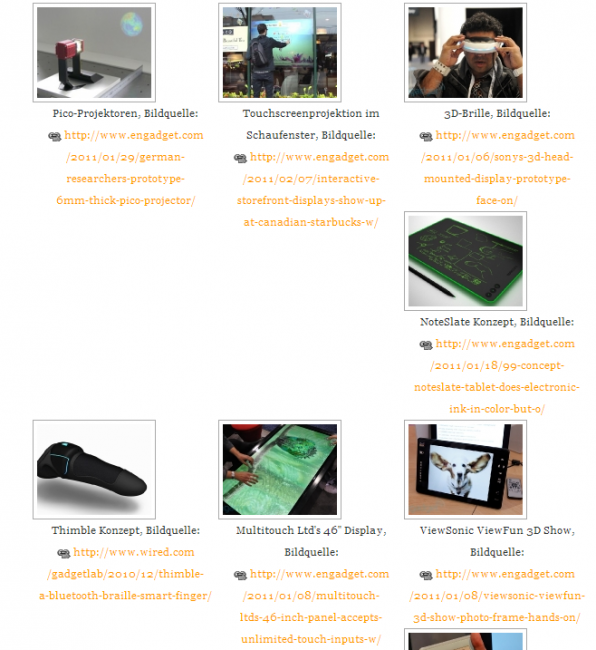 Problem hierbei ist, dass die Quellangaben (zumindest in unserem Fall) meist URLs sind, die i.d.R. eine Länge haben, durch welche die schön gefloateten Thumbnail-Übersichten unruhig würden oder falscch umbrechen, sicher aber schlecht lesbar wären (s. Screenshot):