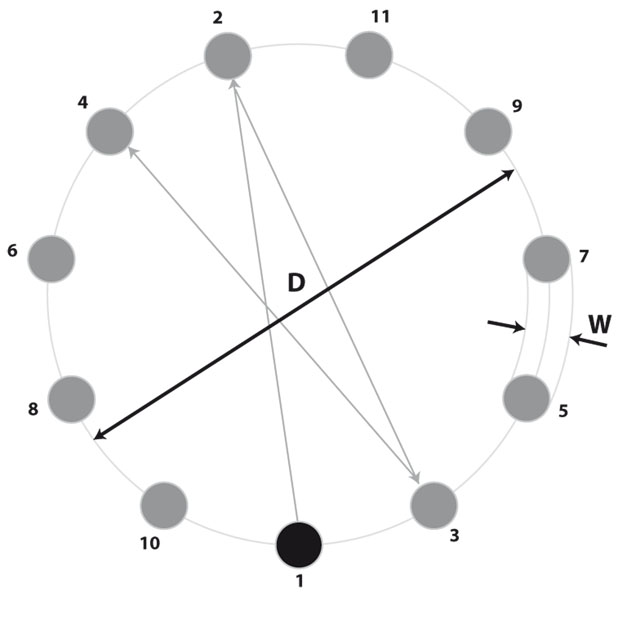 Wie die Abbildung zeigt, mussten die Probanden im MDTT-Test mehrere auf einem Kreis angeordnete Elemente in einer vorbestimmten Reihenfolge anwählen. Wurde ein Element erfolgreich angewählt, ist anschließend das gegenüberliegende Element anzuwählen. Während des Tests wurde die Genauigkeit bei der Berührung der Elemente sowie die Zeit für das Zurücklegen der Wegstrecke zwischen zwei Elementen gemessen. Die Größe der Elemente (W) wird durch den Schwierigkeitsindex (ID) und den Durchmesser des äußeren Kreises (D) nach Fitt’s law berechnet: