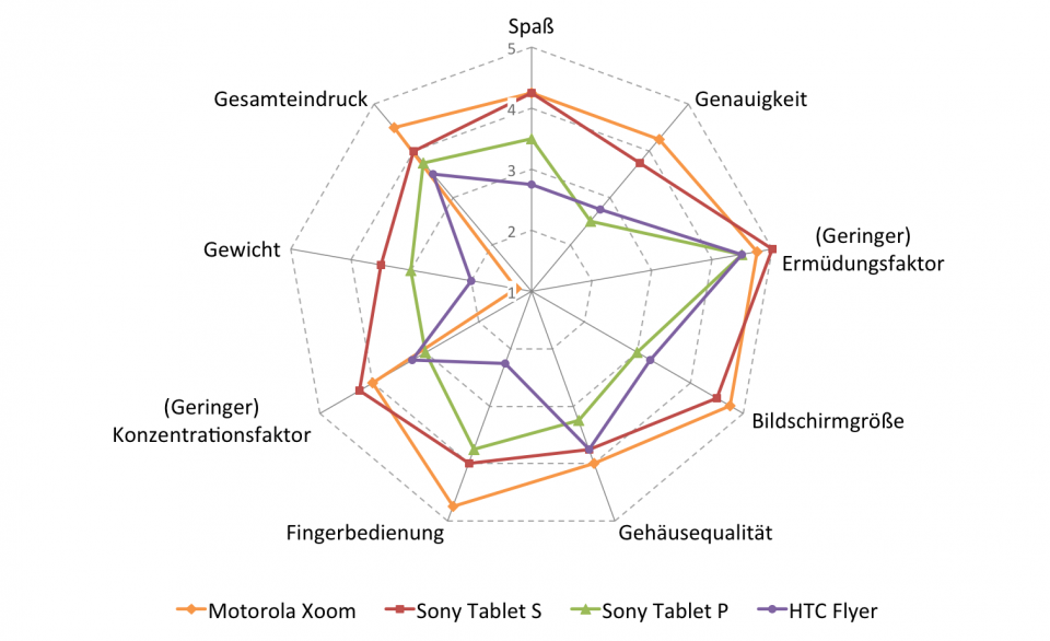 Nicht nur aus den aufgezeichneten Messwerten , sondern auch aus den Fragebögen der Probanden lässt sich das Motorola Xoom als Favorit herausstellen. Für das Tablet wurde mehrfach der erste Platz vergeben. Knapp danach folgt das Sony Tablet S auf dem zweiten Platz. Interessanterweise unterscheidet sich die Platzvergabe je nach Geschlecht. Während Männer eindeutig das Motorola Xoom bevorzugen, vergaben Frauen dem etwas kleineren und leichteren Sony Tablet S die Bestnoten.