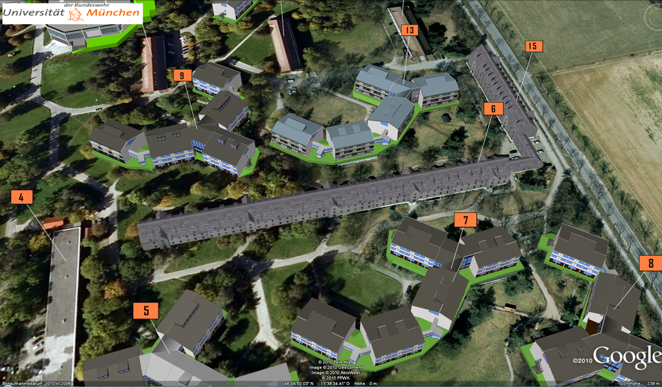 Im Rahmen einer Bachelorarbeit entstand Anfang 2010, dieses 3D-Modell der Universität. Dieses ist für die Plattform von Google Earth ausgelegt worden und alle zugänglichen Daten sind im programmeigenen Format. Die Idee hierbei war es, die Modelle zu exportieren, in einer anderen Umgebung nachzubauen und sie dann für die Navigationssoftware zu nutzen. Die Vorteile die Darstellung wären wieder in der drei-dimensionalen Darstellung. Zudem könnte man flexibel agieren und z.B. Probleme wie verdeckte Informationen umgehen, würde man diese Modelle selbst exportieren und auf eigener Entwicklungsumgebung wiederverwenden.